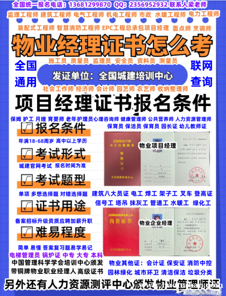 物业经理证上岗证1200、物业项目经理1400报名咨询梁老师、物业管理员950、物业管理师高级1500报名咨询梁老师、